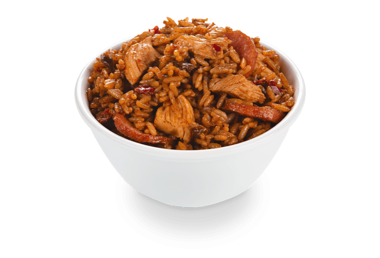 JAMBALAYA-ALouisiana classic packed with bold , soulful flavour . this hearty one pot dish brings together tender chicken , smoky sausage all simmered with rice , peppers , onions and cajun spices . every bite is savory , spiucy , and comforting – true southern goodness in a bowl